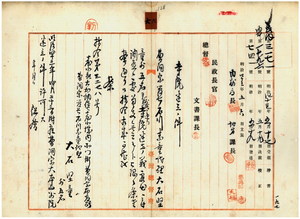 六 曹洞宗管長石川素童代理布教師大石堅竜(台北城内北門街曹洞宗布教所駐在)ト信徒総代ノ賀田金三郎・荒井泰治・金子圭介・沢井市造・小松楠弥ヨリ出願ノ台北庁大加蚋堡台北東門外三板橋庄字課仔脚ニ曹洞宗大本山別院建立スルニ付キ許可ノ件(指令第三二七八号)並ニ台北庁長ヨリ進達サレタ寺院建立認可願ニ関スル本件並ニ真言宗新高野山弘法寺建立(一〇を見よ)ニ付テハ竣成後ノ出願ノ為メ手続上齟齬アリタルニヨリ自今社寺建立ニ付テハ明治三四年民県第三三八号通達ニ従ヒ着手出願スヘキ様取計フヘキ様厳重注意方台北庁長ヘ通達ノ件