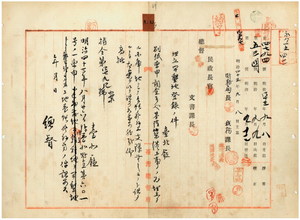 九 台北庁長井村大吉ヨリ稟申ノ基隆築港工事ニ付キ認可済ノ上埋立タル国庫地ノ基隆堡基隆街ノ土名ュ仔リョ・土名福徳・土名媽祖宮口・土名新店・土名草店尾土名石牌・土名義重橋・土名和興頭・土名新興・土名玉田ノ建物敷地・雑種地及ヒ第一地方費区ノ同街土名石牌ノ建物敷地ノ開墾地トシテ取扱方並ニ土地台帳ヘ登録ノ義ニ付認可ノ件(指令第四七九四号)