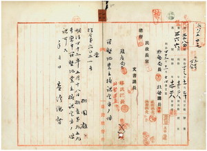 一〇 桃園庁長西美波ヨリ稟申ノ黄水生ヨリ出願ノ同庁竹北二堡十六張庄土名十六張ノ畑、葉奕明ヨリ出願ノ同庁桃澗堡三洽水庄ノ畑、李接文・李娘送ヨリ出願ノ同庁同堡同庄ノ田、蔡鵠ヨリ出願ノ同庁海山堡成福庄土名小暗坑ノ田、伝徳令ヨリ出願ノ同庁同堡中庄土名中庄街ノ田、林熊光ヨリ出願ノ同庁同堡三層土名坑底ノ田ノ開墾地業主権認定方認可ノ件(指令第六〇二一号)