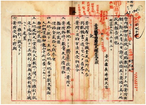 五 台北庁長井村大吉ヨリ同庁管内大加蚋堡崔崢龍山寺街、龍山寺業地雑種地ヲ崔崢市区改正ニ依ル道路敷地トシテ龍山寺管理人林卿雲・信徒総代黄殷朕・同呉采南・管理人李孫蒲ヨリ願出ノ寄附方ニ付キ許可シタル旨報告ノ件