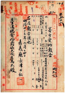 八 阿里山作兼所長ノ請求ニ従ヒ受納シタル鉄道用地ニ付キ嘉義庁長津田毅一ヨリ鉄道用地トシテ大目根堡緞厝リョ庄ノ土地ニ付キ盧春・陳蒼ヨリ寄附サレタルヲ以テ受納シタル旨報告ノ件