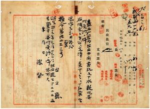 一二 台北庁長井村大吉ノ稟申ニ係ル台北城内道路及下水敷地トシテ大加蚋堡台北城内土名小南門街・府前街・書院街・府后街・文武廟街・西門街ニ係ル土地寄付者小林惣次郎・丸山平八郎・谷口巌・李春生・松浦孝次郎・辜顕栄・台湾銀行管理柳生一義・田中太蔵・瀬崎真一・大阪市東区高麗橋ノ株式会社三十四銀行頭取小山健三・大加蚋堡台北城内西門街ノ台湾日々新報管理守屋善兵衛・遠藤寛哉・津坂鹿次郎・津坂木三郎・宇治原要太・屋善兵衛・金子圭介ノ願出ニ依リ同地ノ建物ノ寄附並ニ受納ニ付キ認可ノ件(指令第四二三三号)