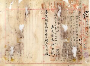 二二 嘉義庁長津田毅一ヨリ下楫仔リョ庄ノ建物敷地トシテ同庁蔦松堡丁楫仔リョ庄ノ建物ヲ郭羅漢ト 鎮ヨリ、港茄警察官吏派出所敷地トシテ同庁大苛田堡港茄庄ノ建物敷地ト原野ヲ陳旺・許雹・呂煬・鄭鰻・陳老盛ヨリ地方税経済ニ寄附受納ニ付キ報告ノ件