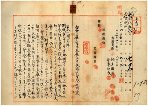 一七 台中庁長枝徳二ヨリ稟申ノ支庁管轄区域中ノ直轄ノ県庄・社口庄・旧社庄・芬園庁・同安藔庄中芬園庄ヲ員林支庁ノ管轄ニ編入スル件ニ限リ認可(指令第四〇八四号)シ且ツ東勢角支庁大坑警察官吏派出所ヲ直轄管内ヘ編入スル件ト東勢角支庁石崗警察官吏派出所部内中ノ林仔口庄ヲ葫芦墩支庁直轄ヘ編入スル件ハ認可相成リ難キニ付キ指令及ヒ本件ヲ台中庁長(通達並ニ区ノ名称及区域内街庄社名並区長役場ノ位置改正ノ告示(告示第一二五号)スルノ件(指令第四〇八四号・告示第一二五号、台警第六五三号、民内第八五六号、167~215)