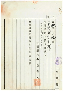 八 第八号 宜蘭庁管下坪林尾公学校修業年限六箇年ヲ明治四四年度ヨリ四五九 第五九号 宜蘭庁管内ノ簡阿結・蕭阿順・羅嬰・黄石枝・徐阿旺・李思景・陳振輝・藍氏阿粉・劉金旺・沈猫梓ハ阿片烟膏購買吸食特許鑑礼並通帳亡失ニ付キ該鑑札及ヒ通帳ヲ無効トス箇年トス