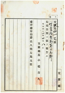 一九 第一九号 台湾土地測量標保管規則ニ依リ所在地宜蘭庁頭囲堡梗枋庄ノ保管委員康烏九死亡ノ為メ鄭発ヲ保管委員ニ任ス