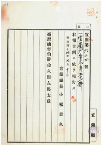 宜蘭廳告示第五十一號阿片煙膏購買吸食特許鑑札並通帳亡失ノ旨嘉義外一廳ヨリ通知ノ件