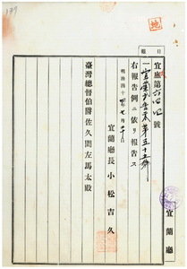 宜蘭廳告示第五十五號阿片煙膏購買吸食特許鑑札亡失ノ旨臺南廳ヨリ通知ノ件
