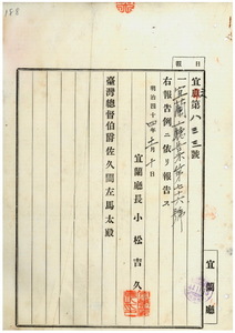 宜蘭廳告示第七十六號阿片煙膏購買吸食特許鑑札同通帳亡失ノ旨嘉義外二廳ヨリ通知ノ件