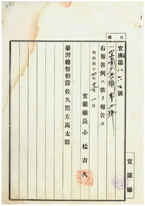 宜蘭廳告諭第二號本年八月下旬及上旬本島各地方暴風雨罹災者救恤金御下賜ノ件
