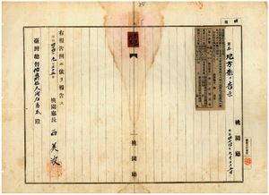 六三 第八七号 桃園庁管内ノ海山堡阿南坑庄范守ト海山堡鳶山庄楊本ノ支那形渓船ノ船鑑札流失ニ付キ該鑑札ヲ無効トス
