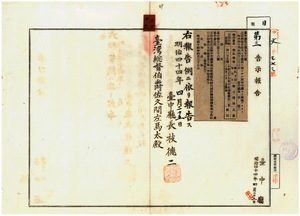 二六 第九六号 新竹庁竹北堡旧港庄載宗ノ支那形船金協順ノ船鑑札紛失ニ付キ該鑑札ヲ無効トスル旨同庁ヨリ通知ノ件