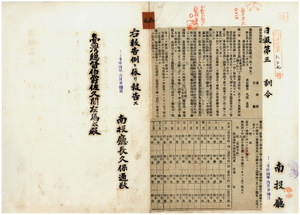 五 第一〇号 脳務担任者服務規程制定ノ件並ニ明治四〇年四月訓令第一〇南投庁訓令第一〇号中誤謬ニ付キ照会及ヒ回答ノ件一六 第二一号 明治四三年六月訓令第二六号庁蕃務所属警察官吏配置定員表中改正ノ件号ヲ廃止ス