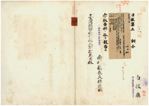 六 第一一号 明治三七年三月南投庁訓令第一一号保甲条例施行細則取扱手続第七条中「十以下」ヲ改正ノ件南投庁訓令第一号訂正報告ノ件南投庁ノ訓令供閲ノ件