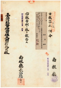 一六 第二一号 明治四三年六月訓令第二六号庁蕃務所属警察官吏配置定員二七 第一一号 嘉義庁管内ニ牛疫及ヒ豚虎列刺発生及ヒ台中庁管内ニ豚虎列剌発生ニ付キ両庁ヨリ通知ノ件表中改正ノ件