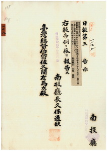 一〇八 第九二号 嘉義庁管内ニ牛疫発生ニ付キ同庁ヨリ通知ノ件