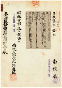 南投廳告示第百十一號八月下旬ヨリ九月上旬ニ至ル暴風雨罹災者救恤金御下賜ノ件