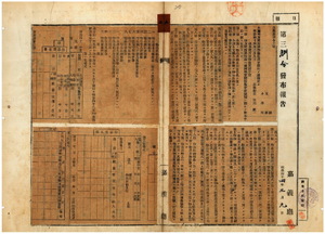 五 第一〇号 本庁地方税所属物品取扱手続制定ノ件五五 第一八号 明治四四年ニ於ケル地押調査ヲ他里霧堡・大坵田堡・打猫北堡・打猫南堡・牛稠渓堡ニ施行ノ件