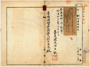 七 第一二号 明治四三年六月訓令第二六号支庁掌理事項中中埔、竹頭崎、斗六支庁ニ追加ノ件五八 第二一号 台中庁馬芝堡瓦■(石+揺の右)庄ヲ豚疫流行地ト認メ豚ノ出入及病毒伝播ノ虞アル物品ノ搬出ヲ停止スル旨同庁ヨリ通知ノ件