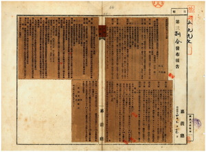 二二 第二七号 区長役場事務監督規程施行細則制定ノ件並ニ明治四一年一〇月嘉義庁訓令第三一号及ヒ明治四二年九月嘉義庁訓令第三一号ヲ廃止シ、明治三五年二月元塩水港庁訓令第三号及明治三九年四月元塩水港庁訓令第一五号並ニ明治三七年七月元斗六庁訓令第一五号ハ本令施行日ヨリ之ヲ適用セス