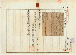 一一 第一一号 台南庁管内効忠里四鯤葮社ノ呉狗・陳猪史・陳賓老・江古ノ竹筏、効忠里安平街許保徳ノ支那形船金順成ノ船鑑札ヲ紛失シ、効忠里海頭社陳習ノ支那形杉板ノ船鑑札ヲ流失ニ付キ自今無効ノ旨台南庁ヨリ通知ノ件