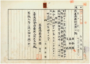 五二 第七号 明治四三年一〇月花蓮港庁訓令第三一号蕃務所属警察職員所轄内出張巡回月額旅費等級中ニ追加ノ件