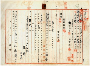 一一 神明会福徳爺会管理人陳蛋・張栄光・孫王・台南西区長陳脩五ニヨル福徳爺会所属財産処分許可願ニ付キ許可ノ件(指令第五六号)