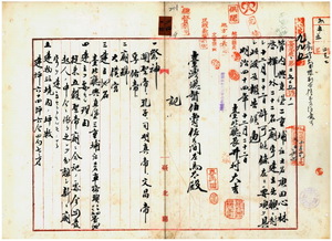 二四 台北庁興直堡二重埔庄土名頂田心林啓輝外二二名[未記載]ヨリ出願ノ同庁同堡三重埔庄土名車路頭ニ大僕宮(祭神関聖帝・孔子・司明真帝・文昌帝・孚佑帝)ヲ建立ニ付キ許可シタル旨台北庁長井村大吉ヨリ報告ノ件