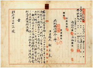 四 強盗殺人犯トシテ起訴サレタル台南庁外新豊里新埔庄ノ胡火炎ハ明治四四年一月二〇日台南地方法院ニ於テ死刑ノ宣言ヲ受ケ次テ同年四月一日覆審法院ニテ死刑宣告確定ニ付キ覆審法院検察官長手島兵次郎ヨリノ死刑執行具申ニ対シ同一八日付ヲ以五 匪徒刑罰令違犯被告人トシテ起訴サレタル新竹庁苗栗二堡苑裡坑庄土名水柳坡ノ李天宝ハ明治四四年二月二五日台中地方法院ニ於ケル死刑判決確定ニ付キ同年六月一四日付覆審法院検察官長代理検察官小野得一郎ヨリノ死刑執行具申ニ対シ同年七月一日付ヲ以テ刑ノ執行ヲ命シ同二日執行シタル旨同小野検察官長代理ヨリ報告ノ件(指令第三八二八号、民内第四三九四号、覆検発第五五二号、覆検発第六四一号、~)テ執行ヲ命シ同二〇日台北監獄ニ於テ執行シタル旨同覆審法院検察官長代理検察官小野得一郎ヨリ報告ノ件(指令第二四一八号、民内第二三六六号、覆検発第二八二号、~)