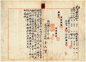 五 匪徒刑罰令違犯被告人トシテ起訴サレタル新竹庁苗栗二堡苑裡坑庄土名水柳坡ノ李天宝ハ明治四四年二月二五日台中地方法院ニ於ケル死刑判決確定ニ付キ同年六月一四日付覆審法院検察官長代理検察官小野得一郎ヨリノ死刑執行具申ニ対シ同年六 覆審法院検察官長代理検察官小野得一郎ヨリ司法警察官執務心得附録様式第一号犯罪事件簿記載例追加ニ付キ報告ノ件(民内第五三八四号、覆検第七二八号、39~40)七月一日付ヲ以テ刑ノ執行ヲ命シ同二日執行シタル旨同小野検察官長代理ヨリ報告ノ件(指令第三八二八号、民内第四三九四号、覆検発第五五二号、覆検発第六四一号、~)