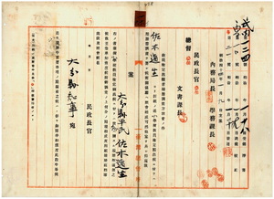 一六 大分県尋常小学校本科正教員ノ免許状ヲ有シ元同県国東郡式渓尋常高等小学校訓導デ現澎湖庁媽宮尋常高等小学校雇ノ佐木道生ヨリ尋常小学校本科正教員無試験検定出願ニ付キ履歴ニ依ル検定合格ト認定シ免許状ヲ授与スルノ件(228~243)