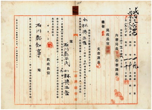 一七 石川県尋常小学校本科正教員ノ免許ヲ有シ元石川県石川郡富樫北尋常小学校訓導デ現台南庁台南尋常高等小学校雇ノ小林与三吉ヨリ尋常小学校本科正教員無試験検定出願ニ付キ履歴ニ依ル検定合格ト認定シ免許状ヲ授与スルノ件(244~259)