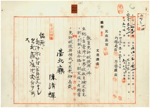 一一 元大稲花公学校勤務台湾公学校訓導台湾総督府民政部内務局勤務陳清輝ヘ台湾公学校訓導無試験検定出願ニ付キ教員免許状授与ノ件