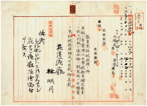 一八 元花蓮港公学校勤務台湾公学校訓導林明月ヘ台湾公学校訓導無試験検定出願ニ付キ教員免許状授与ノ件