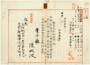 七 北斗公学校勤務台湾公学校訓導陳以波ヘ台湾公学校訓導無試験検定出願ニ付キ教員免許状授与ノ件