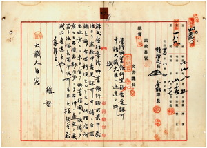 六 株式会社台湾貯蓄銀行取締役頭取荒井泰治ヨリ願出ノ株式会社台湾貯蓄銀行定款変更認可ニ対シ大蔵大臣山本達雄ヨリ認可書下付ニ付キ台湾総督府民政長官ヨリ台北庁長井村大吉ヘ通牒ノ件