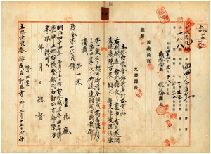 南投庁長久保通猷ヨリ稟申ノ開墾地土地台帳登録(指令第一〇五九号)ノ北投堡北勢囚庄四番ノ八ハ重複附番ニ付キ地番訂正方認可ノ件(指令第一四〇三号)五 台北庁長井村大吉ヨリ稟申ノ土地台帳登録業主氏名文山堡安坑庄ノ陳林呉愛ヲ陳林呉氏愛ニ訂正方認可ノ件(指令第一四八二号)