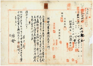 六 台中庁長枝徳二ノ稟申ニ依リ林崧生・林資其ヘ台中庁藍興堡涼傘樹庄、楊必力ト楊必農ヘ大肚下堡沈珍庄土名頂沈珍、陳阿鼻ト陳城ヘ捒東上堡永居湖庄、李忠ヘ苗栗三堡磁■(石+揺の右)庄、林接枝ヘ苗栗三堡新店庄、邱蘭浜ヘ苗栗三堡五里牌庄、林永順ヘ苗栗三堡双■(艹+寮)庄、易全ヘ苗栗三堡田心仔庄、蔡元ヘ大肚中堡北勢坑庄土名大路暦、陳恭ヘ燕霧下堡埤仔頭庄、陳倒・陳池・陳枝ヘ燕霧下堡埤仔頭庄ノ開墾地業主権認定方認可ノ件(指令第三四一九号)
