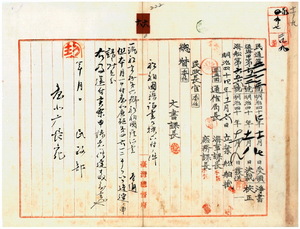 六 臨時台湾総督府工事部長内田嘉吉ノ申請ニ依リ今回ノ官制改正ニ伴ヒ臨時台湾総督府工事部ト改称セラレタルニヨリ同部所属汽船高砂第六号船舶国籍証書書換下付ノ件