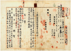 七 拓殖局第一部長宮尾舜治ノ通牒ニ依リ、明治四三年三月日露両国政府ニ於テ取極メヲ為シタル船舶積量互認ノ件ニ関シ同年三月一日逓信省令第五号及ヒ告示第二四三号ヲ発布アリタル処内務省ニ於テ文書ノ行違ガ生シ同件ニ付キ台湾総督府ヘノ通牒洩レガ生ジタル為メ台湾総督府ニ於テハ未タ之ニ関スル府令及ヒ告示ノ発布之レ無キタメ不都合之レ有リタルニヨリ然ル可キ取計方ニ関スル通牒ニ伴ヒ船舶積量互認ノ件ニ関スル日露両国政府間ニ於ケル取極メニ基付ク条規制定(府令第九二号)及ヒ明治三一年六月府令第三六号台湾船舶積量測度規則ニ依リ船舶国籍