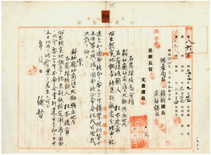 五 新竹庁竹北一堡新竹街土名南門外ノ松本徒爾・同庁同堡三角店ノ芥川善治ヨリ出願ノ新竹庁管内ニ於ケル石炭採掘願許可ノ件