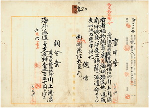 二〇 台湾総督府農事試験場長高田元治郎ノ内申ニ依リ台湾総督府農事試験場技師川上瀧弥ニ植物調査ノ為メ海峡殖民地・暹羅・南洋諸島・印度・錫蘭ヘ出張ヲ命シ海外派遣ニ付キ支度料ヲ給ス