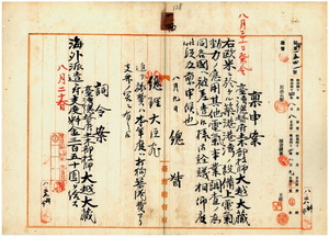 一四 台湾総督府土木部長内田嘉吉ノ内申ニ依リ台湾総督府土木部技師大越大蔵ヘ築港港湾ノ設備上電気動力ノ応用其他電気事業ニ関スル調査ノ為メ欧米各国ヘ差遣ヲ命シ(八月二一日付)支度料ヲ給ス(八月二六日付)