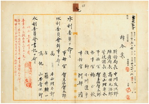 九 台湾総督府民政部土木局長事務取扱内田嘉吉ノ内申ニ依リ台湾総督府民政部財務局長中川友二郎・台湾総督府民政部殖産局長高田元治郎・台湾総督府警視総長亀山理平太・台湾総督府事務官賀来佐賀太郎・台湾総督府参事官楠正秋・台湾総督府技師小川運平・台湾総督府事務官阿部滂ニ水利委員会委員ヲ命シ、台湾総督府事務官賀来佐賀太郎ニ水利委員会幹事ヲ命シ、台湾総督府属ノ本山理太郎・藤井顧一ト台湾総督府嘱託山本音次郎ニ水利委員会書記ヲ命ス