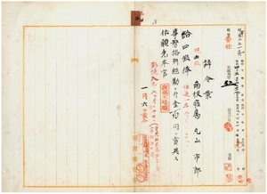 三 南投庁属丸山市郎ハ麻拉里亜ニ罹リ職ニ堪ヘサル旨ヲ以テ辞職願書ヲ差出シタルモ本人ハ明治四二年八月税務課国税係員トシテ土地検査ノタメ埔里社ヘ出張中立会ノ本島人ト言語ノ行違ヒヨリ争論トナリ該本島人ヲ殴打シ痛ク侮辱ヲ与ヘタル為メ地方民ノ憤怒ヲ招キ以来職務執行上遺憾ノ点多ク他庁ヘノ転任モ効ヲナサス明治四三年七月発病シタルコトモアリ辞職ヲ止ムヲ得ストノ南投庁長久保通猷ノ内申回答ニ依リ昇級ノ上事務格別勉励ニ付キ一時金ヲ賞与シ本官ヲ免ス