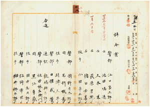 二八 台湾総督府民政部蕃務本署長大津麟平ノ内申ニ依リ台湾総督府警部ノ江口良三郎・池田鳴遠(明治四三年一二月二二日付)・久米栄・萩原宗熊(明治四四年一月六日付)・猪口安喜・岡野才太郎・毛利誠意・日種成簣・垣田林左衛門・黒江勇蔵・松野常世・原田倭・和田衛、台湾総督府技手ノ小田平三郎・財津久平・田中元次郎・細井桝太郎・森丑之助・高山辰次郎、台湾総督府通訳飯島幹太郎ヘ蕃人討伐又ハ捜索事務ニ関シ其地域内ヘ出張シタルトキハ其間月俸十分ノ七ヲ給スル辞令書ヲ受ケタル義ト心得ヘシ