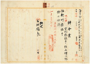 六三 台北庁長井村大吉ト新竹庁長家永泰吉郎ノ内申ニ依リ財務課直税係地図主任ノ補助事務ニ従事セシムル為メ台北庁技手杉山増次郎ヲ新竹庁技手ニ任ス