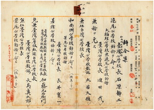 一三一 台北庁長井村大吉ノ内申ニ依リ和尚洲公学校勤務台湾公学校長石原静三ニ滬尾公学校勤務ヲ命シ、大稲花公学校兼滬尾公学校勤務台湾公学校長迫田茂ノ兼務ヲ免シ、大稲花公学校女子分校兼大稲花公学校勤務台湾公学校教諭大苗大雅ヲ台湾公学校長ニ兼任シ和尚洲公学校勤務ヲ命シ、景尾公学校勤務台湾公学校長長井実一ニ基隆公学校勤務ヲ命シ、基隆尋常高等小学校兼基隆公学校勤務台湾小学校教諭兼台湾小学校長台湾公学校教諭兼台湾公学校長加藤元右衛門ノ台湾公学校教諭台湾公学校長兼任ヲ免シ、基隆公学校勤務台湾公学校教諭大島真太郎ヲ台湾公学