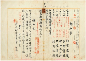 二〇 淡水郵便局長永井元男ノ内申ニ依リ淡水郵便局通信助手ノ松原尭蔵・長野実諒・原田庄太郎・石原貞雄ト淡水郵便局通信事務員萩野文蔵ヲ台湾総督府通信手ニ任シ淡水郵便局勤務ヲ命ス尚通信助手河瀬多気士ノ通信手任用ノ内申ハ詮議相成ラス
