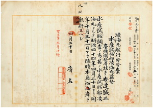 八四 台湾総督府民政部殖産局長高田元治郎ノ内申ニ依リ水産試験船凌海丸監督台湾総督府技手安達誠三ヘ水産試験調査ノ為メ凌海丸ヲシテ明治四四年四月二〇日ヨリ同四四年一〇月三一日マテ随時本島沿岸ヲ航行セシムルヲ命ス